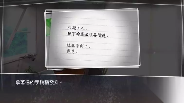 调查书架 (十五年前,身为高三学生的主人公在杂志上征求笔友,文野亚弥主动来信建立了两者之间的笔友关系。然而这样的交流在第十封信之后戛然而止,给主人公留下了较为酸楚的感受。) 这叠信件的最后一封居然从未开封,更奇怪的是其居然没有邮戳,打开后发现当中只有令人惊悚的内容: 我杀了人。 犯下的罪必须要偿还。 就此告别了。 再见。