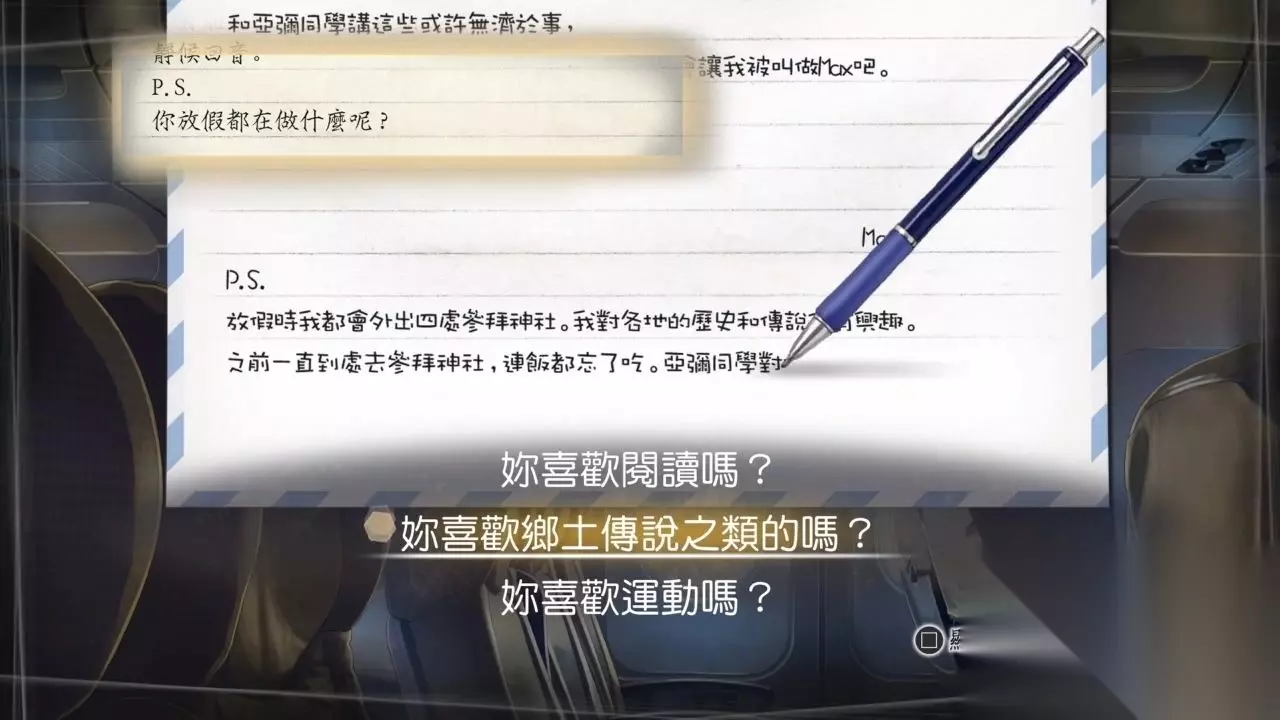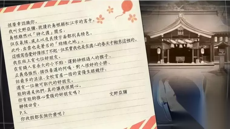 阅读第一封信 这里就要开始回信了,这也是本部作品的特色系统,在读到亚弥信末的PS部分时,玩家要通过选项选择,组合成自己十五年前回复的内容。(注意:目前是单流程攻略,当中这种自由选择并没有参考作用,至于每个选项的背后意义和对结局的影响,之后会逐一补全。) P.S. 你放假都在做什么呢? 都在看书 √去四处参拜神社 出去玩 你喜欢阅读吗? √你喜欢乡土传说之类的吗? 你喜欢运动吗?