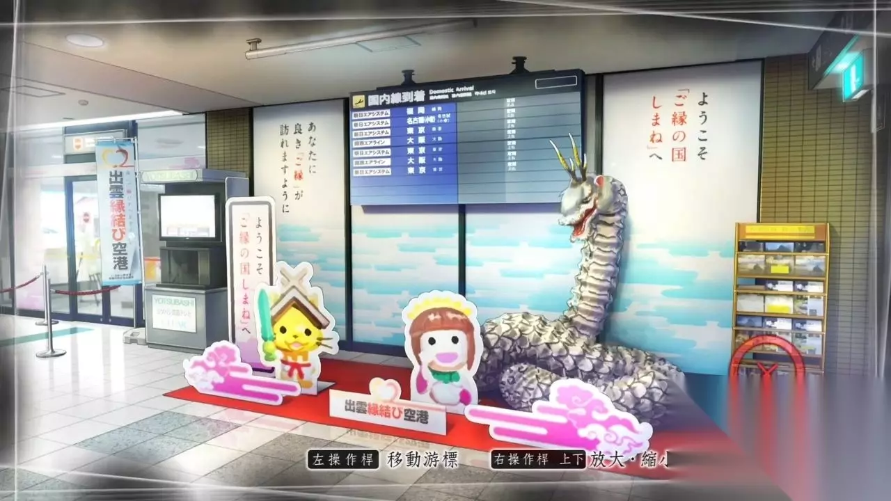 记得点击书架最下层 点击观光导览获得教学指示,岛根县的观光形象大使SHIMANEKKO突然靠了过来,并告知一大堆旅游资讯(全都给省略号了……),之后却莫名逃掉了。既然要去松江市,那么就需要乘坐机场巴士了。 在出云大社前站·候车室,调查大门动身搭上一畑电车。