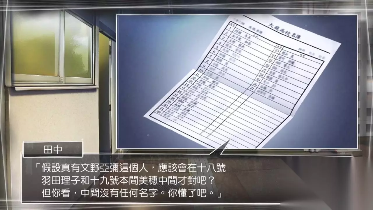 田中对亚弥的回忆 亚弥的信件触动了田中,或许此时发问能知晓点什么,询问田中文野亚弥的地点: 文野亚弥 田中表情突然再度僵硬起来,又摆出矢口否认的态度,为了证明这一点拿出了十五年前松江大庭高中的学生名册。 的确在这当中没有找到文野亚弥的名称。