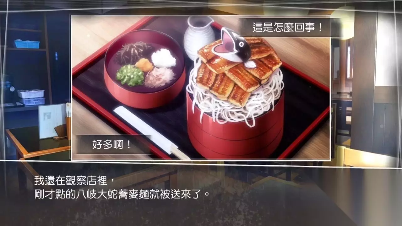 从邮差口中得知失火事件 消息足够令人震惊,但肚子此时也咕咕叫了,点击观光导览找到附近有家名为神在庵的荞麦面店,继续移动至神在庵。 神在庵的店员三平递来一份菜单,主人公点选一份份量超大的『八歧大蛇荞麦面』。随便调查一下店内,面食就送上来了。