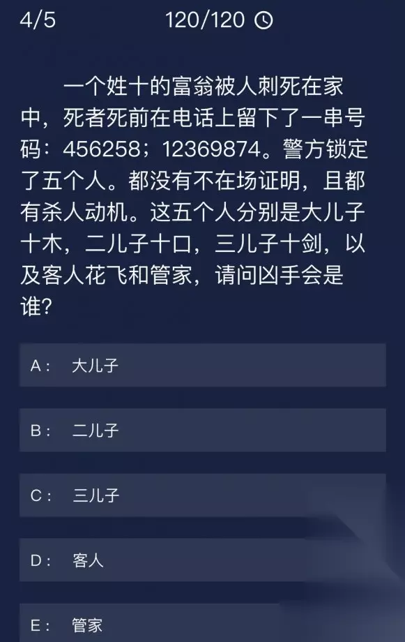 题目: 一个姓十的富翁被人刺死在家中,死者死前在电话上留下了一串号码: 456258; 12369874.警方锁定了五个人。都没有不在场证明,且都有杀人动机。这五个人分别是大儿子十木,二儿子十口,三儿子十剑,以及客人花飞和管家,请问凶手会是谁? 答案:二儿子 答案解析: 将这些数字对应电脑的小键盘,打出来的字就是十口,所以凶手就是二儿子。 游戏简介 全球推理侦探的专属社区,各地用户上传真实的案件供大家探讨,许多国家地区的破案率因此而大大提升。 繁华喧闹的都市背后时刻酝酿着巨大的危机,一宗宗案件的背后是一个又一个不为人知的秘密。当一个人的心中充满了黑暗,罪恶便在那里滋长起来,有罪的并不是犯罪的人,而是那制造黑暗的人... 最近更新 1.优化页面响应速度 2.新增举报功能