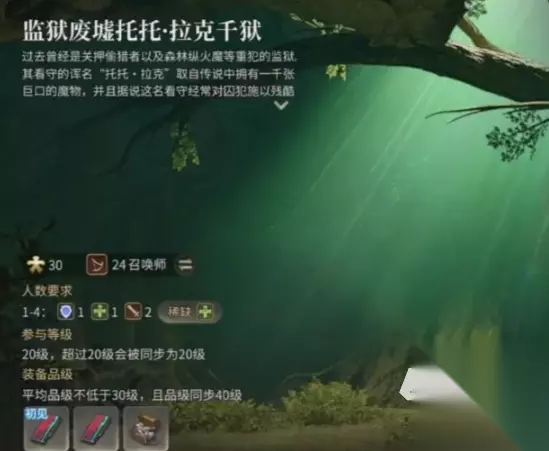 2.拉克千狱副本 这是一个玩家们中期会遇到的副本,此副本本身是一个关押重犯的监狱,但是在几十年之后,这里面已经变的魔物丛生。玩家们想要进入这个副本,首先所做的第一件事情就是需要将主线任务推到20级,同时还需要完成浮出水面的敌人这个任务后才会开启这个副本。在达成这个条件之后玩家们可以在巴斯卡隆这里接取到千狱深处的响声,之后我们一路前往任务的指引地点,路上遇到敌人可以直接无视,在快到的下方会有些敌人,玩家们可以考虑提前将其给消灭掉,之后便可以解锁副本。