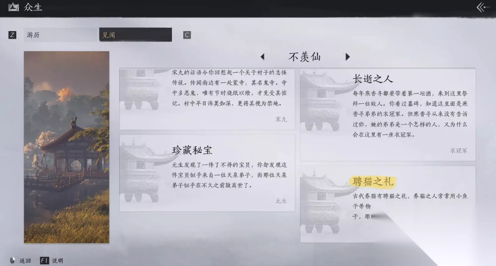 不羡仙在灾前的见闻一是逸事死人刀,需先找到NPC蛮子刘和赛关爷。对话触发见闻并完成后,接着去活人医馆附近找NPC姚药药。对话后能触发天叔踪迹的见闻,继续前往瓷窑附近找到宋九。触发南面禁地的灾前见闻,完成后继续在不羡仙附近探索。找到附近的衣冠冢并查看碑文,能触发长逝之人的见闻。寻找NPC元生并帮他找到宝贝,即可完成珍藏秘宝的任务。寻找NPC王甫虎并与其对话,就能触发灾前的另一个神仙渡任务。去往溪水边上寻找沽酒侍女,对话就能触发灾前的三浸一饮。溪水边还有两位正在对话的角色,听完剧情能触发流觞饮会的灾前。