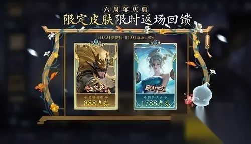 1、马超-神威、伽罗-太华、妲己-时之彼端、百里守约-朱雀志、铠-青龙志,这五块皮肤为今年六周年的限定皮肤。 2、妲己-时之彼端、百里守约-朱雀志、铠-青龙志将上架周年庆返场专区,大家可以从这三款皮肤中任选一款购买,且每个游戏角色仅可购买其中一款(仅能自己购买,无法赠送他人) 3、有喜欢的玩家千万不要错过这次的限定皮肤了,不然下次返厂就不知道是什么时候了。 以上是小编为各位带来王者荣耀六周年限定皮肤一览的全部内容,更多精彩游戏资讯,请持续关注233乐园。 【小编推荐】专区入口 || 视频站入口 || 体验服申请入口 || 全民竞猜赢好礼 【新英雄爆料】| 司马懿 || 瑶 || 孙策 || 新英雄:囚徒/书圣/瞬 | 【新皮肤爆料】| 李白团战皮肤:敏锐之力new || 诸葛亮团战皮肤:掌控 || 典韦穷奇皮肤 Hot!! | 王者荣耀最新攻略 赛季段位继承表 每日一题 边境突围玩法攻略 体验服爆料