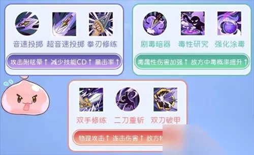 仙境传说重生盗贼的转职和进阶讲解 属性优势 1、敏捷(AGI):维持持续输出和生存能力 2、幸运(LUK):增强爆发伤害 成长路线 初心者→盗贼(一转)→刺客二转|base35级)→十字刺客二转进阶|base62级) 提示:base50级前技能点可免费自由重置,base50级后也可以使用道具重置 技能讲解 1、盗贼阶段,学习解毒、残影是提升保证前期生存的保障,隐匿解除时还可以对首个目标造成额外伤害。