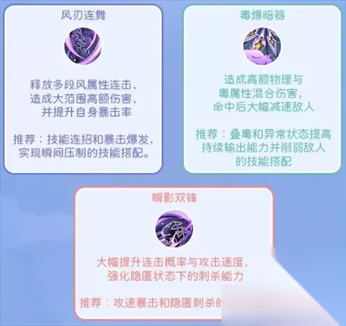 2、二转成为刺客后,解锁翻滚躲避和影刃分别提高攻速和闪避,隐匿强化则可以提高暴击率,减少技能CD,让后续的连招更流畅。