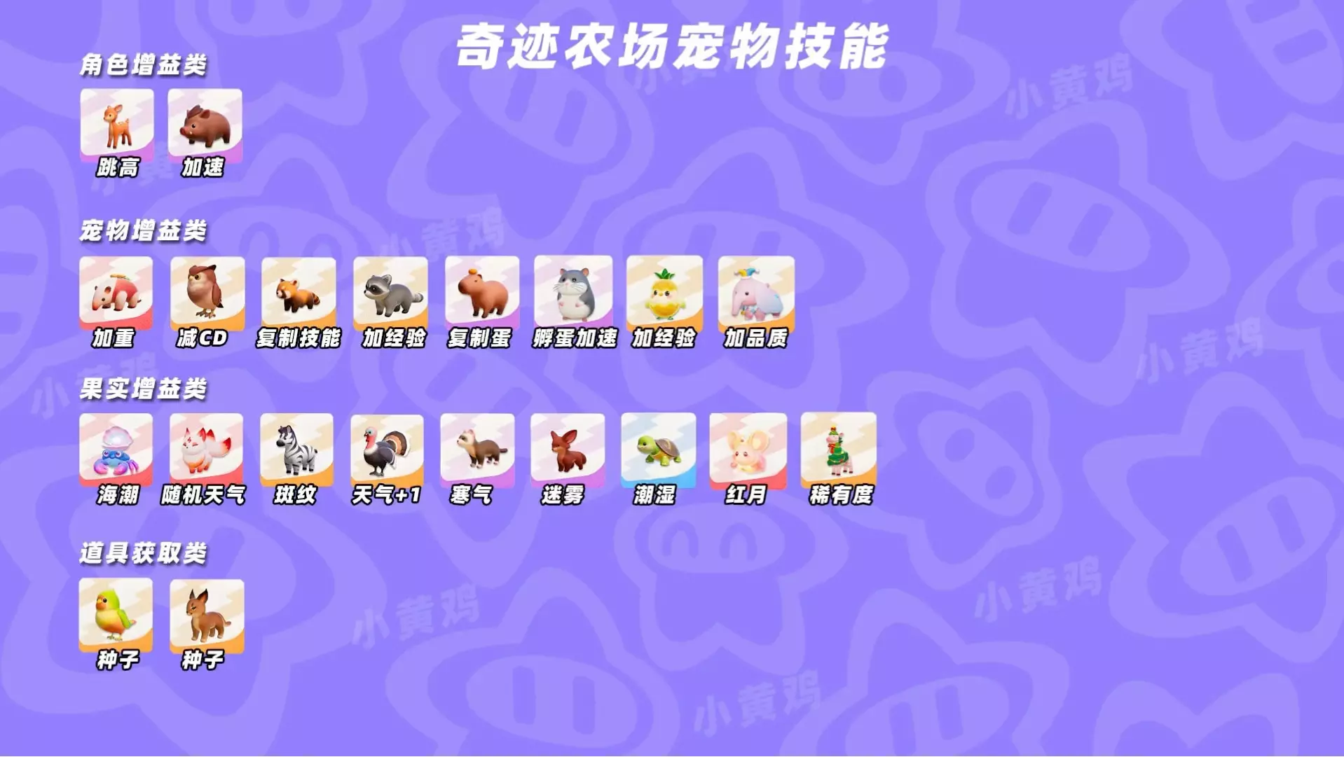 这是关于《元梦之星》奇迹农场的宠物搭配攻略,将农场宠物按孵蛋、偷种子、果实突变等功能分类,还给出了可上场2到3只小浣熊的搭配建议,帮助玩家了解合适的宠物搭配方案。
