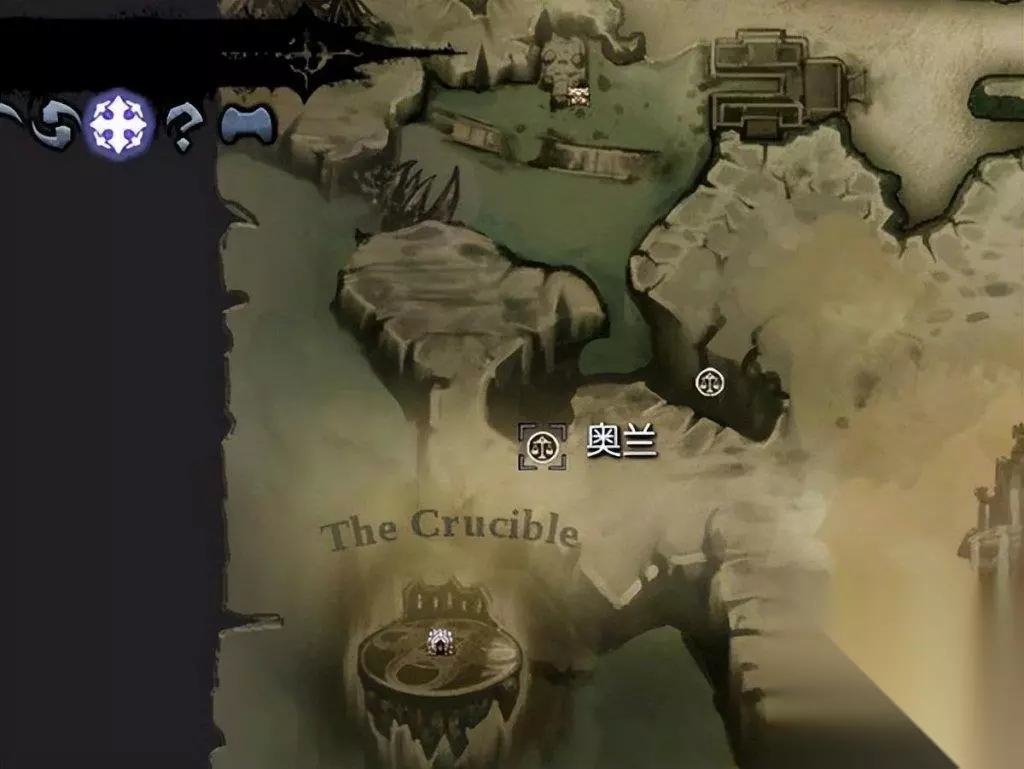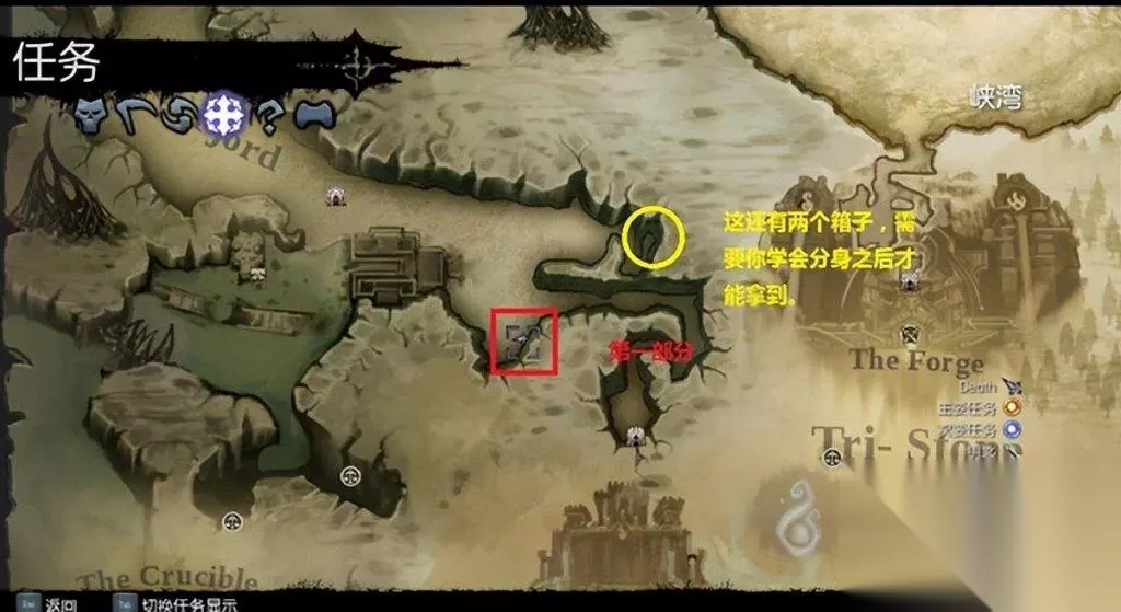 4.首先要找到的是奥兰的左臂(地图上以红色标明),在奥兰的左臂上方还有两个箱子,需要学会分身技能后才能够取得。