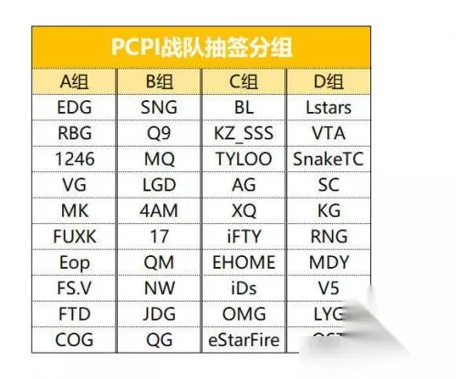 A组:EDG RBG 1246 VG MK FUXK Eop FS.V FTD COG B组:SNG Q9 MQ LGD 4AM 17 QM NW JDG QG C组:BL KZ_SSS TYLOO AG XQ iFTY EHOME iDs OMG eStarFire D组:Lstars VTA SnakeTC SC KG RNG MDY V5 LYG OST