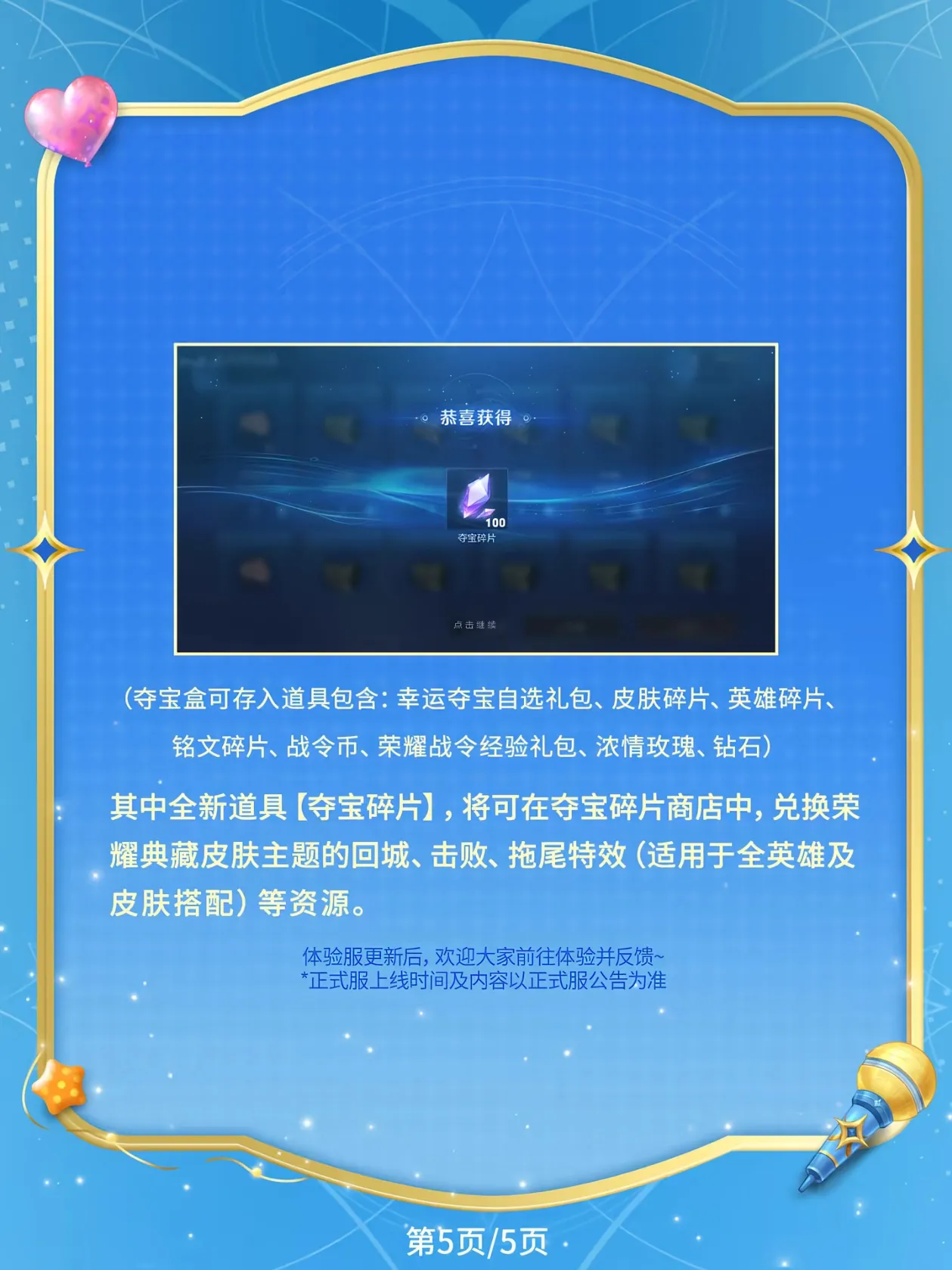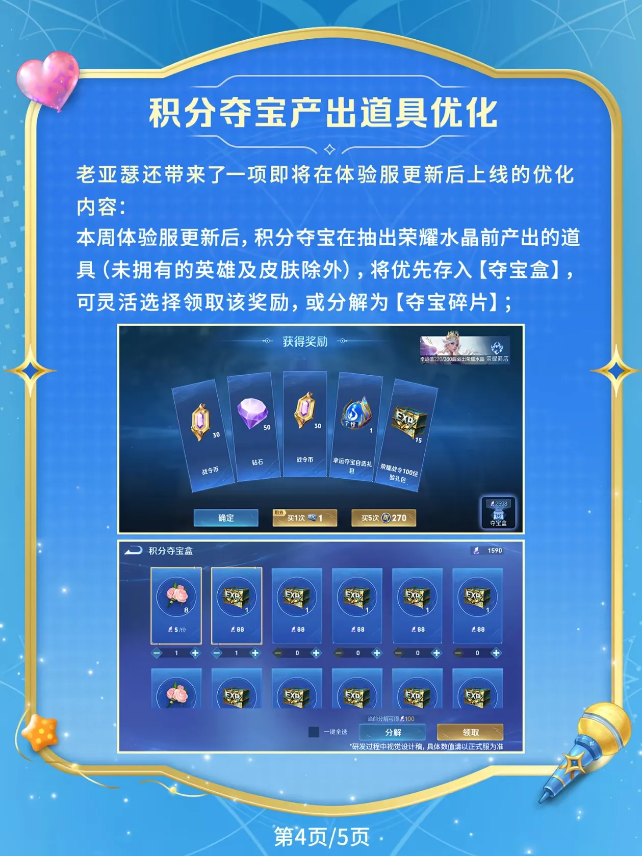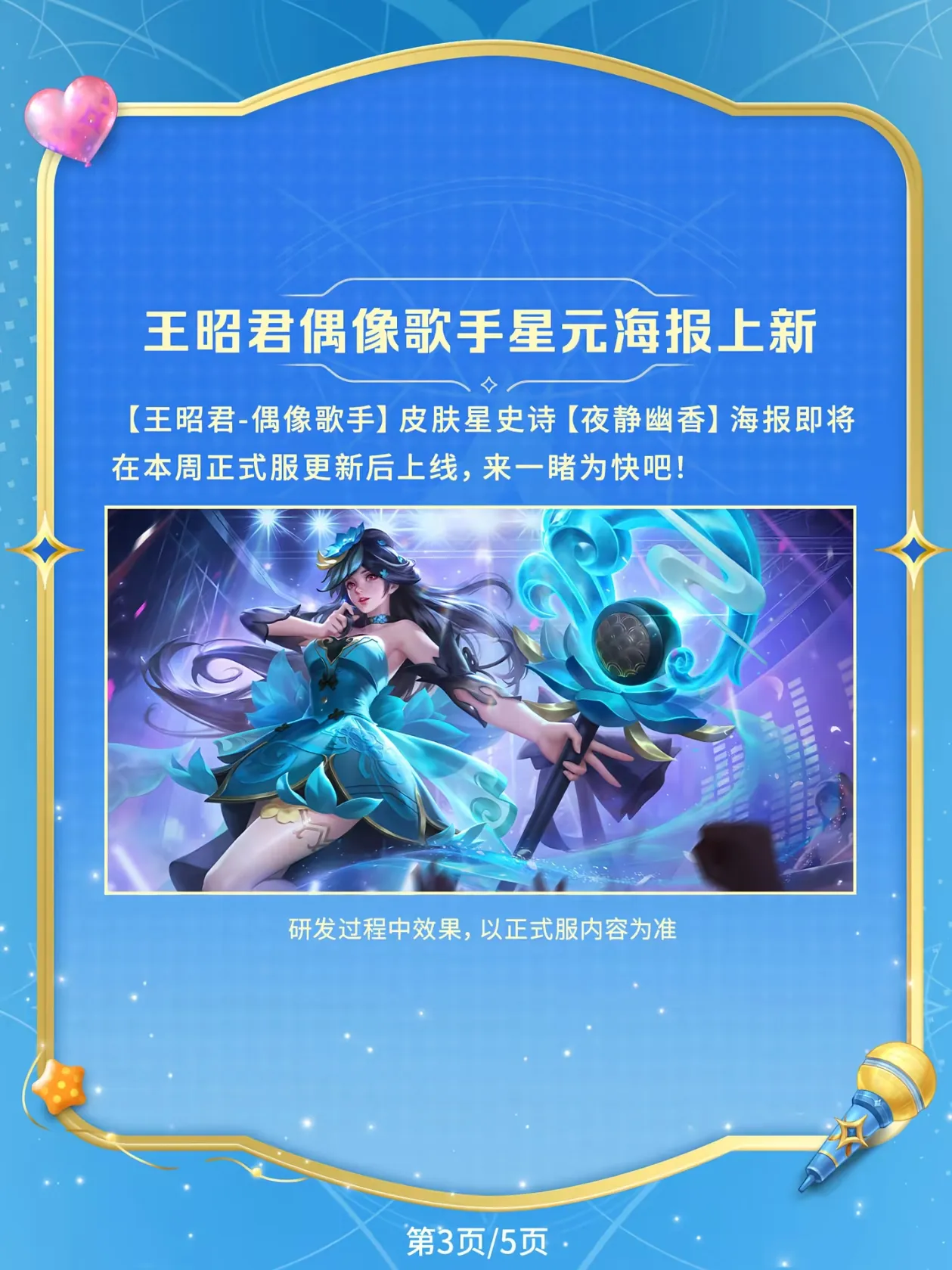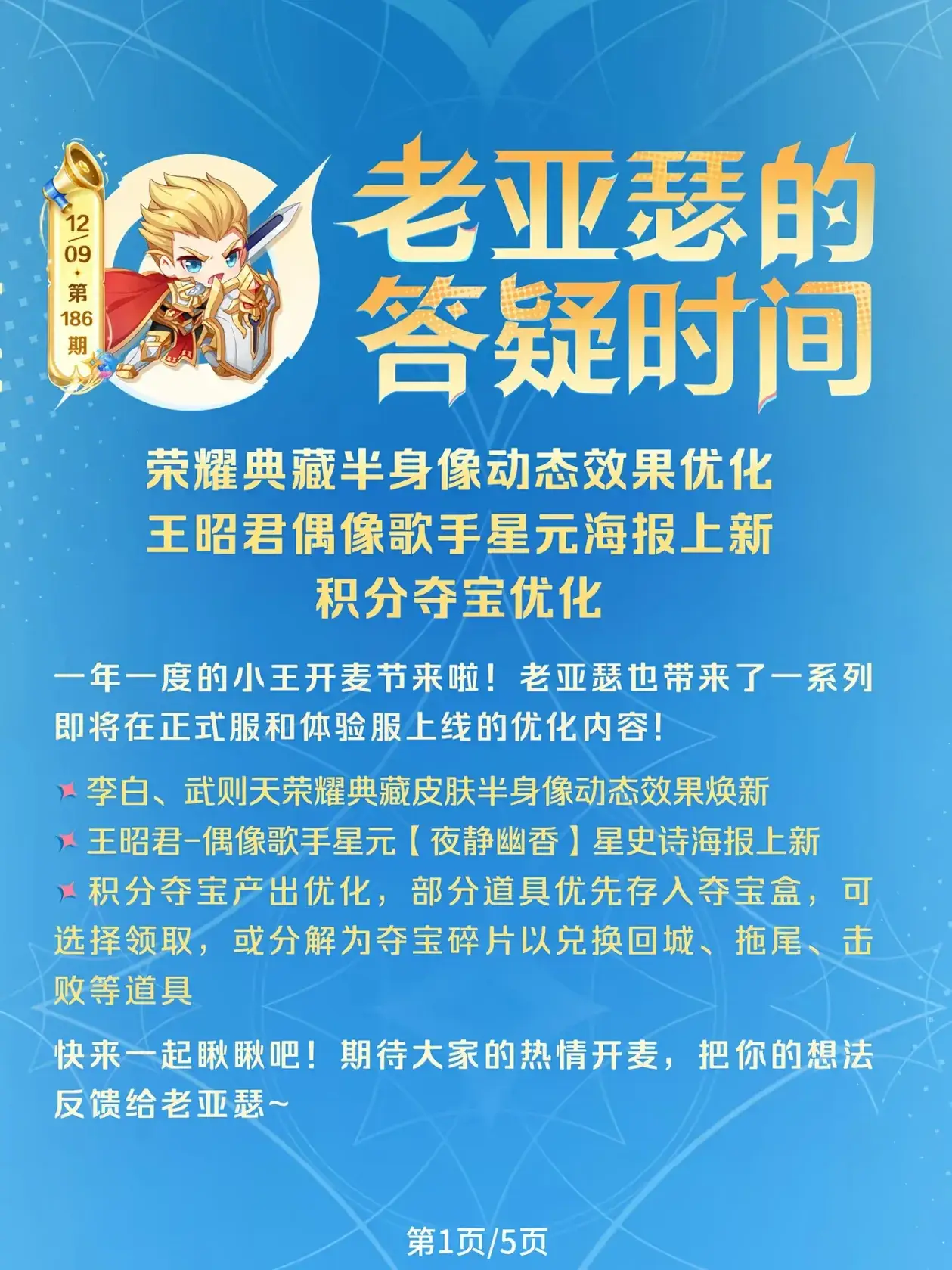 本期包含荣耀典藏半身像动态效果优化、王昭君-偶像歌手星元海报上新,以及积分夺宝优化~