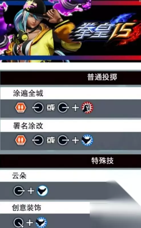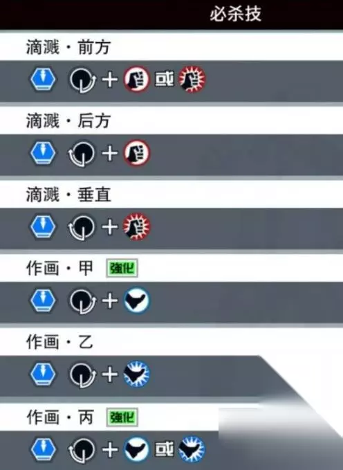 八、必杀技 前方滴溅:在空中,先按↓↘→,然后选择轻拳或重拳。 后方滴溅:在空中,先按↓↙←,然后轻拳。 垂直滴溅:在空中,先按↓↙←,然后重拳。 作画·甲:在空中,先按↓↘→,然后轻脚。 作画·乙:在空中,先按↓↘→,然后重脚。 作画·丙:在空中,先按↓↙←,然后选择轻脚或重脚。