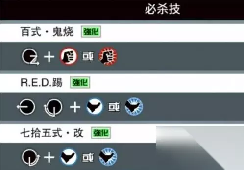 六、必杀技,百式·诡烧:→↓↘ 轻拳或重拳,彩虹能量回旋踢:←↓↙← 轻脚或重脚,七拾五式·改:↓↘→ 轻脚或重脚。