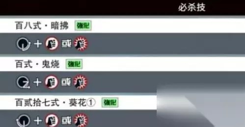十、必杀技,百八式·暗拂:↓↘→ 轻拳或重拳,百式·诡烧(:→↓↘ 轻拳 或 重拳,百贰拾七式·葵花①:↓↙← 轻拳或重拳。