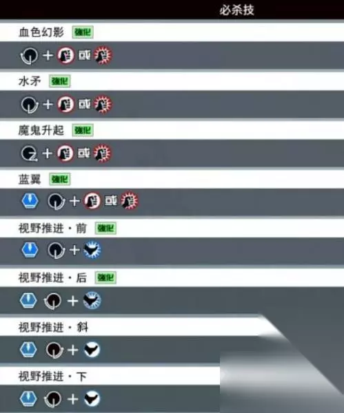 三、必杀技 血色幻影:按↓↙←,然后轻拳。 水矛:按↓↘→,然后轻拳或重拳。 魔鬼升起:按→↓↘,然后轻拳或重拳。 蓝翼:在空中时,按↓↘→,然后轻拳或重拳。 视野推进·前:在空中时,按↓↘→,然后重脚。 视野推进·后:在空中时,按↓↙←,然后重脚。 视野推进·斜:在空中时,按↓↘→,然后轻脚。 视野推进·下:在空中时,按↓↙←,然后轻脚。