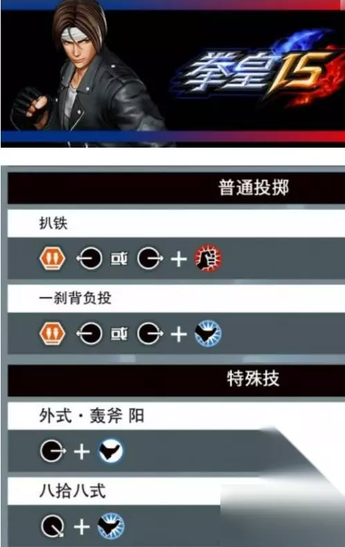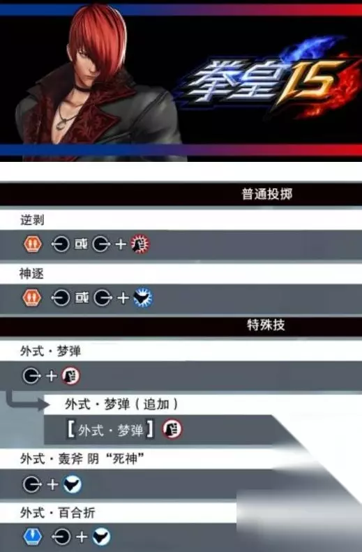 九、八神庵特殊技,外式·梦弹:→ 轻拳,外式·梦弹(追加):[外式·梦弹 过程中]轻拳,外式·轰斧 阴“死神”:→ 轻脚,外式·百合折:[空中] ← 轻脚。