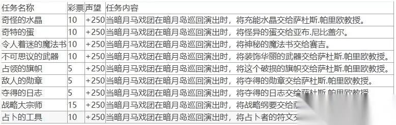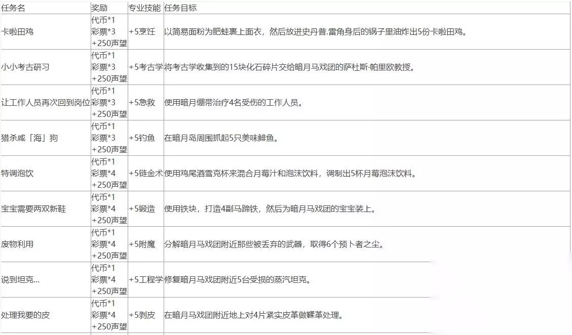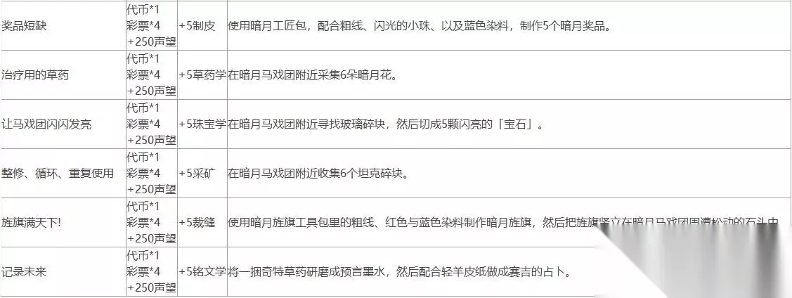 魔兽世界10.0暗月马戏团全声望任务攻略 这次暗月马戏团所新增的任务相当多,除了用来换彩券的每日小游戏任务之外,专业技能也有专属的任务,而缴交物资的任务也更多样化了(根本就是物资消耗大作战)! 每日小游戏任务