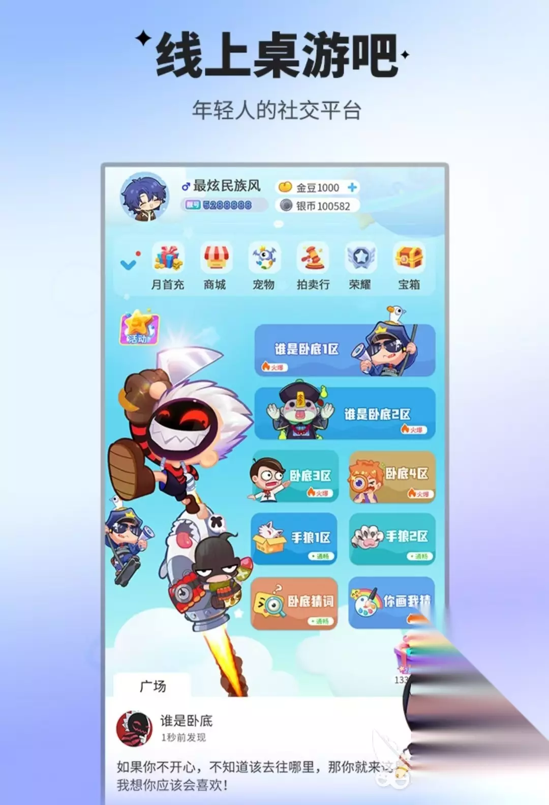 多人游戏推理脑力风暴,找到说谎的人,把阵营里的伪装者投票出去,自己的队伍就胜利。需要考察在场谁在说谎,而抽到卧底牌的人则需要伪装,骗过其他人的眼睛。支持自己开设房间邀请朋友,每个人都有自己的形象,支持定制装扮,也可以和其他线上玩家共同PK。三大阵营超过十种职业,各自有不同的技能,多种玩法撞击出新的游戏火花,各位好友各拼本事骗过众人。 》》》》》#谁是卧底#《《《《《 2、《旋转陀螺多人对战》