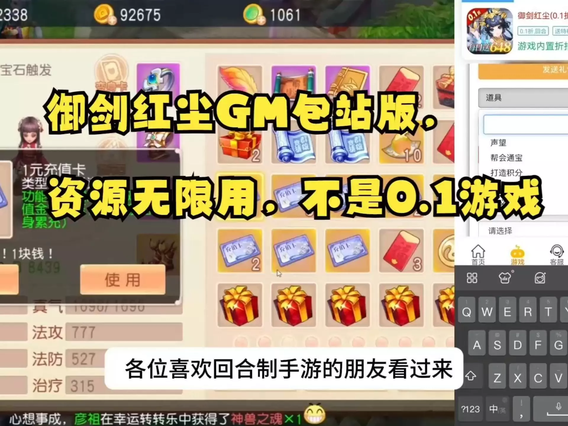 这是回合制手游御剑红尘的GM包站版,该版本资源可无限使用,有大量充值卡、礼包等资源,还能随意使用礼包码,可自行刷取资源,不是0.1折扣版本。