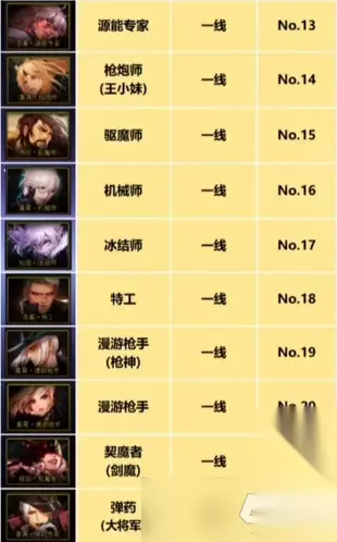 一线职业有:源能专家、枪炮师、驱魔师、机械师、冰结师、特工、男漫游枪手、女漫游枪手、契魔者、弹药。 二线