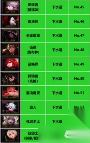 下水道职业有:缔造者、血法师、男柔道家、街霸、召唤师、狩猎者、混沌魔灵、旅人、死灵术士、驭剑士。 臭水沟