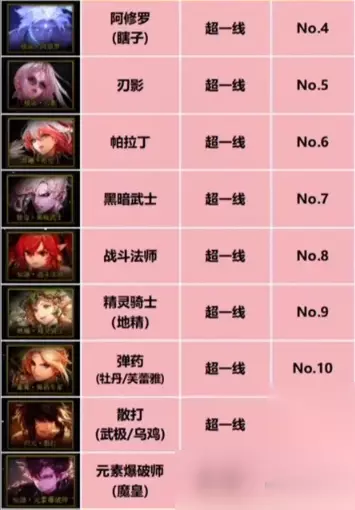 超一线职业有:阿修罗、刃影、帕拉丁、黑暗武士、战斗法师、精灵骑士、弹药专家、散打、元素爆破师。 一线