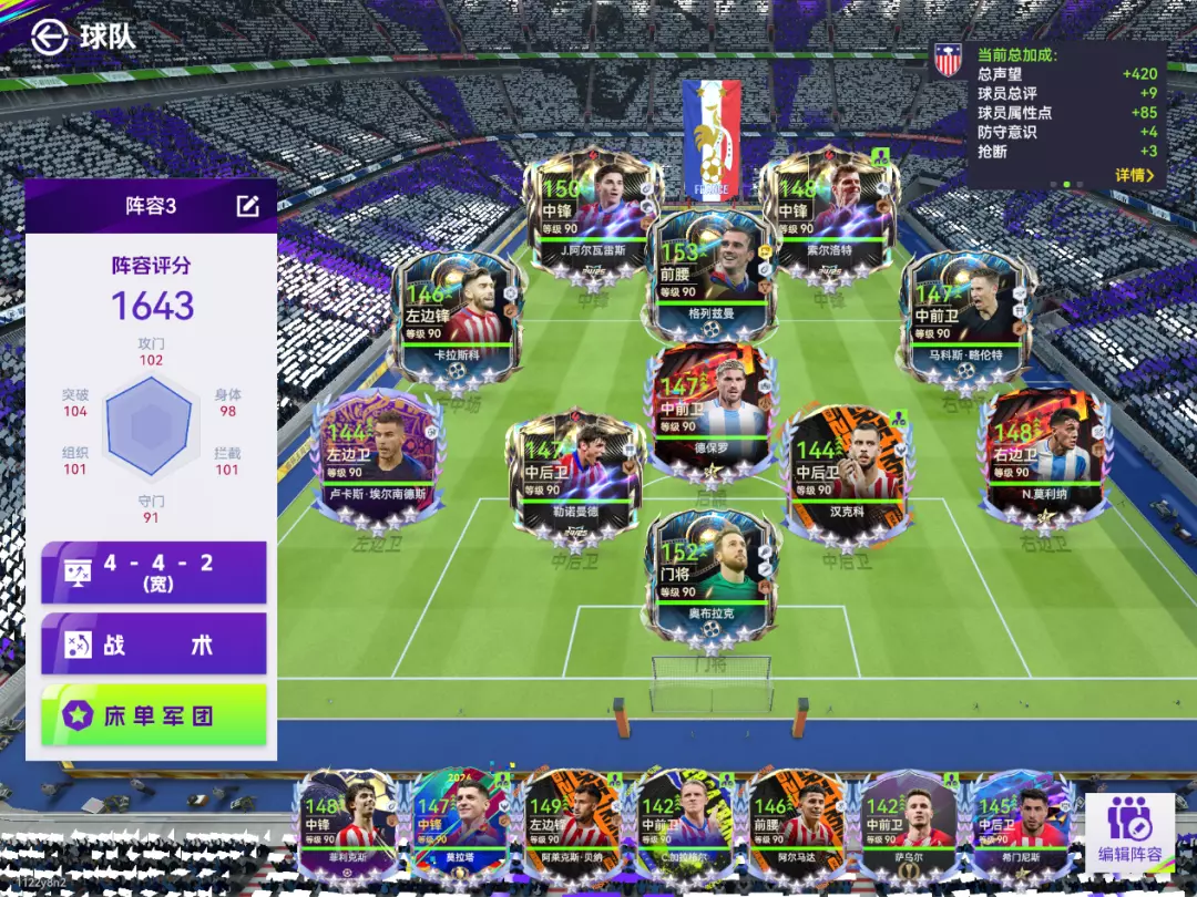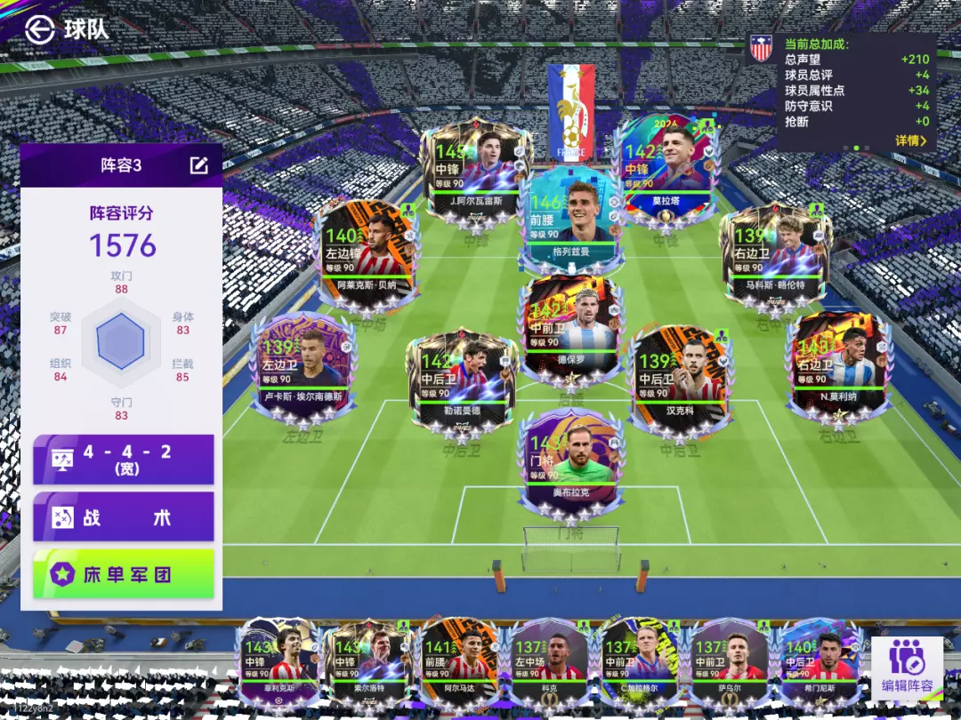 这次新上了三位经典时刻主题的马竞球员,经典时刻格列兹曼、经典时刻卡拉斯科以及经典时刻马科斯·略伦特,这三位这些球员大大加强了马竞队套的中前场强度。经典时刻格列兹曼是现版本中最强的一位拥有金【快速弧线球】特性的前腰。卡拉斯科以及略伦特两边中场的技能也很契合,弥补了之前马竞队套进攻力不足的问题。马竞队套算是比较冷门的队套,但现在只需要找一位高强度的外援中后卫作为首发球员,这套阵容就会是最完美的马德里竞技!
