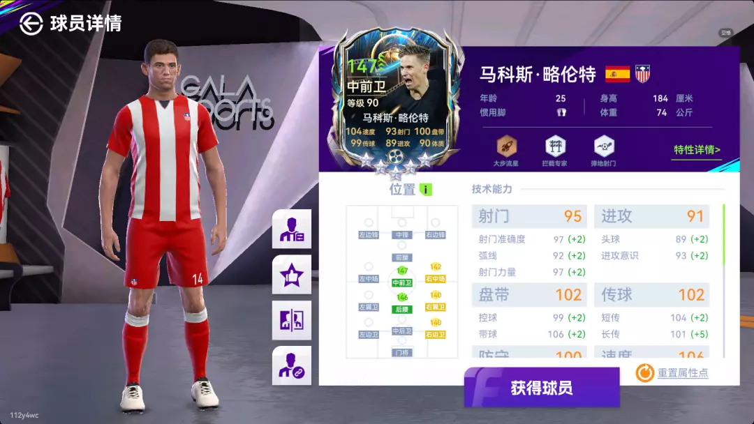 我在这次经典时刻表演赛中使用的核心球员是经典时刻马科斯·略伦特。这张略伦特作为六边形全能中场,模型与手感也是相当地棒。他拥有【大步流星】、【拦截专家】和【弹地射门】这三个攻防兼备的特性。非常贴合他在19-20赛季欧冠中的高光表现。