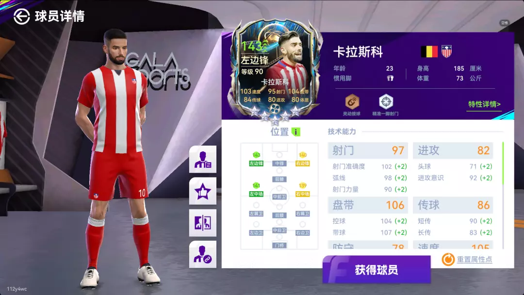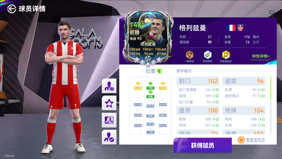 这张格列兹曼拥有三特性的优势以及现版本最强的数据,手感也是非常超标的。三个T0的特性,尤其是金特性【快速弧线球】弥补了马竞队套之前进攻的火力不足的问题,他在前腰位置的进攻传球盘带也非常适配马竞体系。
