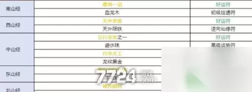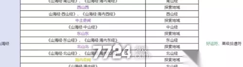 2、西山经图鉴 (1)天外来客(用好运符)。 (2)天外陨铁(用逆向仙缘符)。 3、中山经图鉴 (1)五行至宝之一(用好运符)。 (2)避水珠(用高级运势符)。 (3)巧夺天工(用好运符)。 (4)龙纹合金(用逆向拾遗符)。 4、东山经图鉴 (1)传说中的力量(用好运符)。 (2)不死树(用中级神农符)。 5、北山经图鉴 (1)神兵锻材(用好运符)。 (2)奇才神铁(用中级勘探符)。 二、特殊探索地域:山海经图鉴(用好运符和高级拾遗符即可) 1、南山南:山海经-南山经、山海经-海内南经。 2、西山西:山海经-西山经、山海经-海内西经。 3、东山东:山海经-东山经、山海经-海内东经。 4、北山北:山海经-北山经、山海经-海内北经。 5、中土奇闻:山海经-中山经。 6、海内奇闻:山海经-海内经。 7、关于修仙这件事(南山经、西山经、中山经):修仙轨事、飞升秘籍。 8、神秘人(南山经、西山经、中山经):银面具、披风、拐杖。 三、寻宝道具推荐 1、优先:罗盘。 2、次选:袋子、云。 3、最后选:指南针。 2、玩家在找到对应图鉴的时候要记得带好对应的符纸才能做好相关的事情,玩家找的时候只要注意一般都是能找到对应想了解的隐藏图鉴的。