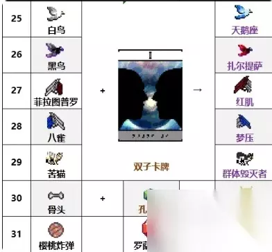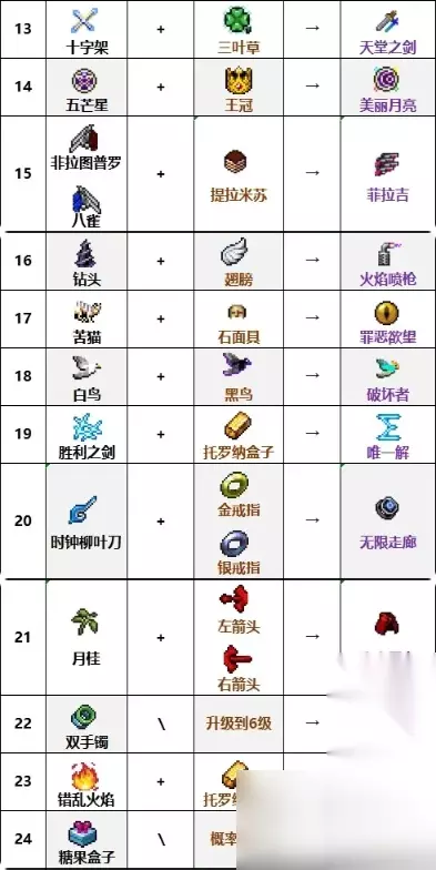 二、详细合成内容 1、鞭子+空心=血鞭 2、吸血鞭+神圣鞭=超吸血鞭 3、经+拼写器=邪恶晚祷 4、飞刀+手套=千刃 5、符文追踪器+护甲=破坏 6、火焰之仗+菠菜=地狱之火 7、大蒜+红心=噬魂者 8、圣水+吸引器|=短绒 9、闪电戒指+复制器=雷环 10、魔杖+cd书=圣魔仗 11、法力之歌+咒脂酸=曼纳迦 12、斧子+烛台=死亡施风 13、十字架+三叶草=天堂之剑 14、五芒星+王冠=美丽月亮 15、非拉图普罗/八雀+提拉米苏=菲拉吉 16、钻头+翅膀=火焰喷枪 17、苦猫+石面具=罪恶欲望 18、白鸟+黑鸟=破坏者 19、胜利之剑+托罗纳的盒子=唯一解 20、时钟柳叶刀+金戒指+银戒指=无限走廊 21、月桂+左箭头+右箭头=实血尸布 22、双手锡+升级到6级=三手镯 23、错乱火焰+托罗纳的盒子=穆斯佩尔的骨灰 24、糖果盒子+概率开出=超级糖果盒 25、白鸟+双子座卡片=天鹅座 26、黑鸟+双子座卡片=扎尔提萨 27、菲拉图普罗+双子座卡片=红肌 28、八雀+双子座卡片=梦压 29、苦猫+双子座卡片=群体毁灭者灭者 30、骨头+孔雀石(地图-蝙蝠国度遗物)+慕斯塔乔等级需要达到80级 = 慕斯塔乔的灵魂 31、银风+红心=庆典之风 32、大有四时+烛台+菠菜=曳行 33、悔夜引+复制器=回声之夜 34、幻无垢+吸引器=乔多尔 35、蓝泡+拼写器=虚幻气泡 36、太宵+石面具=村正 三、特殊合成 1、和平鸽+乌木之翼=破坏者 2、菲拉图普罗+八雀+提拉吉苏=菲拉吉