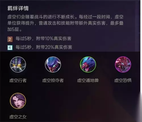 虚空羁绊属性讲解 【云顶之弈s1赛季】虚空:被选中虚空单位造成真实伤害。 【2】:随机一名虚空单位。 【4】:所有虚空单位。 【金铲铲之战时空裂痕】虚空:虚空英雄每过5秒,就会获得普攻和技能附带额外真实伤害,最多叠加5层。 【2】:每过5秒,获得10%额外真实伤害。 【4】:每过5秒,获得20%额外真实伤害。 虚空英雄:卡萨丁、螳螂、挖掘机、大虫子、卡莎。 可以看到,金铲铲之战跟云顶之弈s1赛季当时的虚空羁绊,做了一定的平衡,过去的4虚空一旦成型后伤害就爆炸,现在说实话弱化了很多,因为战斗基本上在10秒之内就定胜负了,10秒只能叠两层。 云顶之弈虚空羁绊效果介绍就介绍到这里,如果对您有所帮助,不妨转发给其他需要的玩家,更多相关攻略正在添加中。