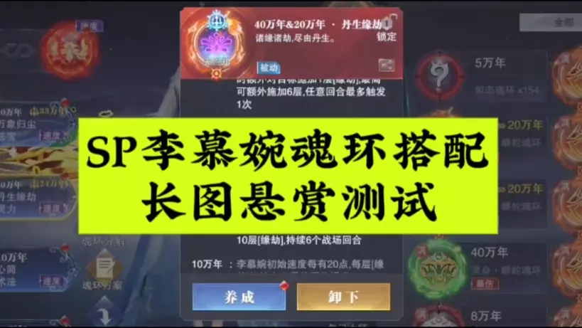 这是手游《斗罗大陆:魂师对决》的SP李慕婉5红测试情报,展示了李慕婉的魂环“丹生缘劫”的不同年份效果,还有测试所用的高评分阵容,能为玩家培养该角色提供参考。