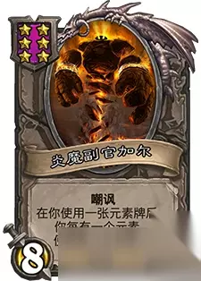 炎魔副官加尔 星级:6 基础属性:8/1 效果:嘲讽。在你使用一张元素牌后,你每有一个元素,便获得+1生命值。 类型:随从 系列: 酒馆战棋 随从种类: 元素