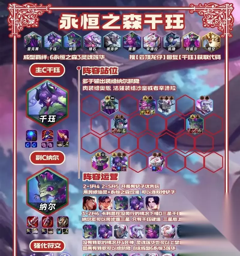 初期战术布局与队伍合作 在游戏初期,我们需要通过合理的战术布局来保证队伍的发育和生存能力。可以利用帝国和护卫骑士阵容的特点,形成小规模战斗,增加队伍输出和生存能力。同时要注重队伍合作,合理利用英雄技能和位置来提高整体战斗效果。 核心英雄选择与升级路径 在中期游戏中,我们需要选择并升级核心英雄。帝国护卫骑士阵容的核心英雄可以选择德莱厄斯和莫德凯撒等具有较高输出和生存能力的英雄。通过不断升级和装备这些核心英雄,提高整体战斗力。 合理利用羁绊加成与装备选择 帝国护卫骑士阵容依靠帝国和护卫骑士两个羁绊来提升整体实力。在选择英雄时要注重搭配羁绊效果,合理利用羁绊加成来增加输出和防御能力。同时,在购买装备时也要结合英雄的特点选择适合的装备,提高整体战斗力。 后期团队战与位置安排 在后期游戏中,帝国护卫骑士阵容通过队伍输出和防御能力的提升来取得优势。在团队战中,合理安排英雄的位置,利用护卫骑士的坚韧和帝国的输出能力,击败敌人并保护核心英雄。 反制策略与应对措施 在游戏过程中,我们需要根据敌方的阵容选择合适的反制策略。对于敌方输出型阵容,可以选择增加防御能力;对于敌方坦克型阵容,可以选择增加输出能力。合理的反制策略和应对措施将有助于我们在游戏中取得胜利。 合理利用经济和技能 在游戏中,经济和技能的合理利用是取得胜利的关键。在经济上,要合理进行金币管理和投资,为后期的英雄升级和购买提供支持。在技能上,要善于利用英雄的技能和位置来控制战斗节奏,提高整体输出和生存能力。 多样化的战术组合与创新 帝国护卫骑士阵容虽然有着明确的核心英雄和羁绊,但我们也可以根据实际情况灵活调整战术组合。可以尝试不同的英雄搭配和羁绊组合,寻找最适合自己的战术策略。 实战经验分享与团队配合 在游戏中,我们要注重团队配合和交流。分享实战经验和建议,与队友共同制定战术策略,以最大化整体实力。团队配合的默契和合作是取得胜利的重要保障。 帝国护卫骑士阵容的弱点与克制 帝国护卫骑士阵容虽然强大,但也有其弱点和克制。敌方具有控制能力的英雄和阵容会对我们造成威胁,需要及时采取应对措施。了解并克服帝国护卫骑士阵容的弱点是取得胜利的重要环节。 实战技巧与操作要点 在实际游戏中,我们要注重一些实战技巧和操作要点。如合理选择英雄摆放位置,控制技能释放时机等。这些细节上的优化将为我们在游戏中带来更大的优势。 团队角色定位与配合策略 在帝国护卫骑士阵容中,不同英雄有着不同的角色定位。合理安排队伍的角色定位,配合策略来达到最佳效果。如选择一个核心输出英雄和一个坦克英雄来平衡输出和防御。 帝国护卫骑士阵容的优势与注意事项 帝国护卫骑士阵容凭借其高生存能力和输出能力,在LOL云顶之弈中有着较大的优势。但需要注意的是合理的金币管理、灵活的战术搭配和团队配合。只有在这些方面做到合理运用,才能真正发挥出帝国护卫骑士阵容的威力。 通过本文的介绍,我们了解到了帝国护卫骑士阵容的特点和优势,以及如何进行合理的搭配和战术策略。在游戏中,我们要注重团队合作和交流,灵活应对敌人的反制策略。相信在实际游戏中,我们能够通过帝国护卫骑士阵容获得更多的胜利!