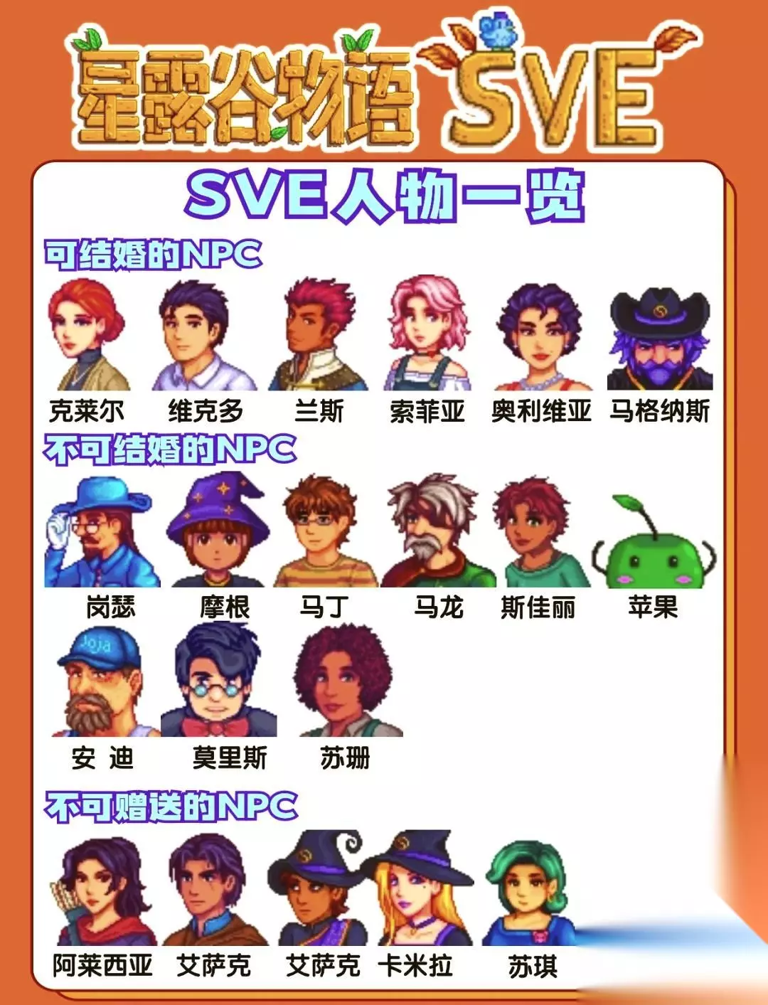 星露谷物语SVE是一款像素画风的模拟经营游戏,在SVE这个版本中,共有15位可赠送礼物的NPC角色,还有6位是不可赠送的。很多新入坑的玩家还分不清这些,灵宝也是整理了详细的图文攻略,让你一图轻松知道答案。如果本攻略对你有帮助,希望能收藏本站哦,每日为你提供最新最准确的游戏攻略。