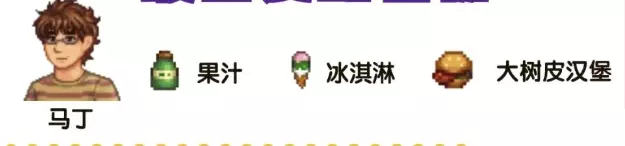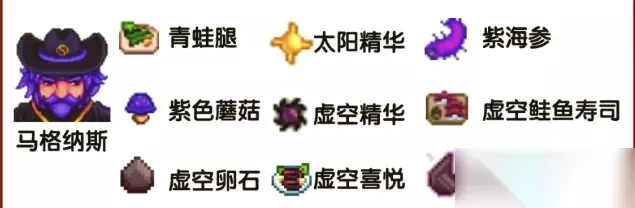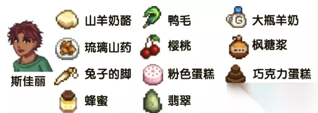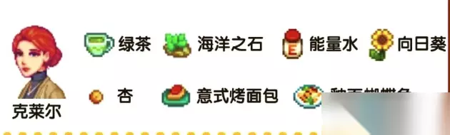 星露谷物语SVE全人物角色喜好汇总 1、克莱尔:向日葵、海洋石、绿茶、香酥面糊炸鲳鱼、能量滋补水、意式烤面包、杏子
