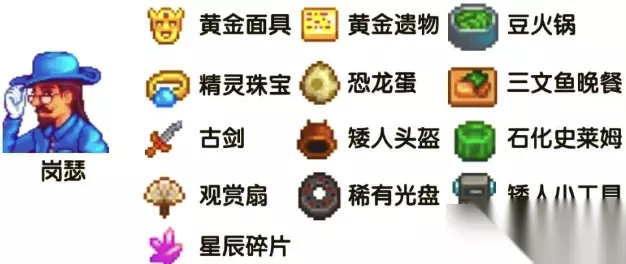 15、岗瑟:恐龙蛋、矮人小工具、黄金遗物、黄金面具、矮人头盔、稀有圆盘、装饰用扇子、精灵珠宝、鲑鱼晚餐、豆类火锅、石化史莱姆、古剑