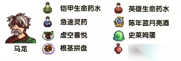 2、兰斯:陈酿蓝月亮、虚空碎片、热带咖喱、涡卷石、鱼类鳟鱼、华丽财宝箱、怪物蘑菇、匕首鱼、绿色蘑菇、银河之魂