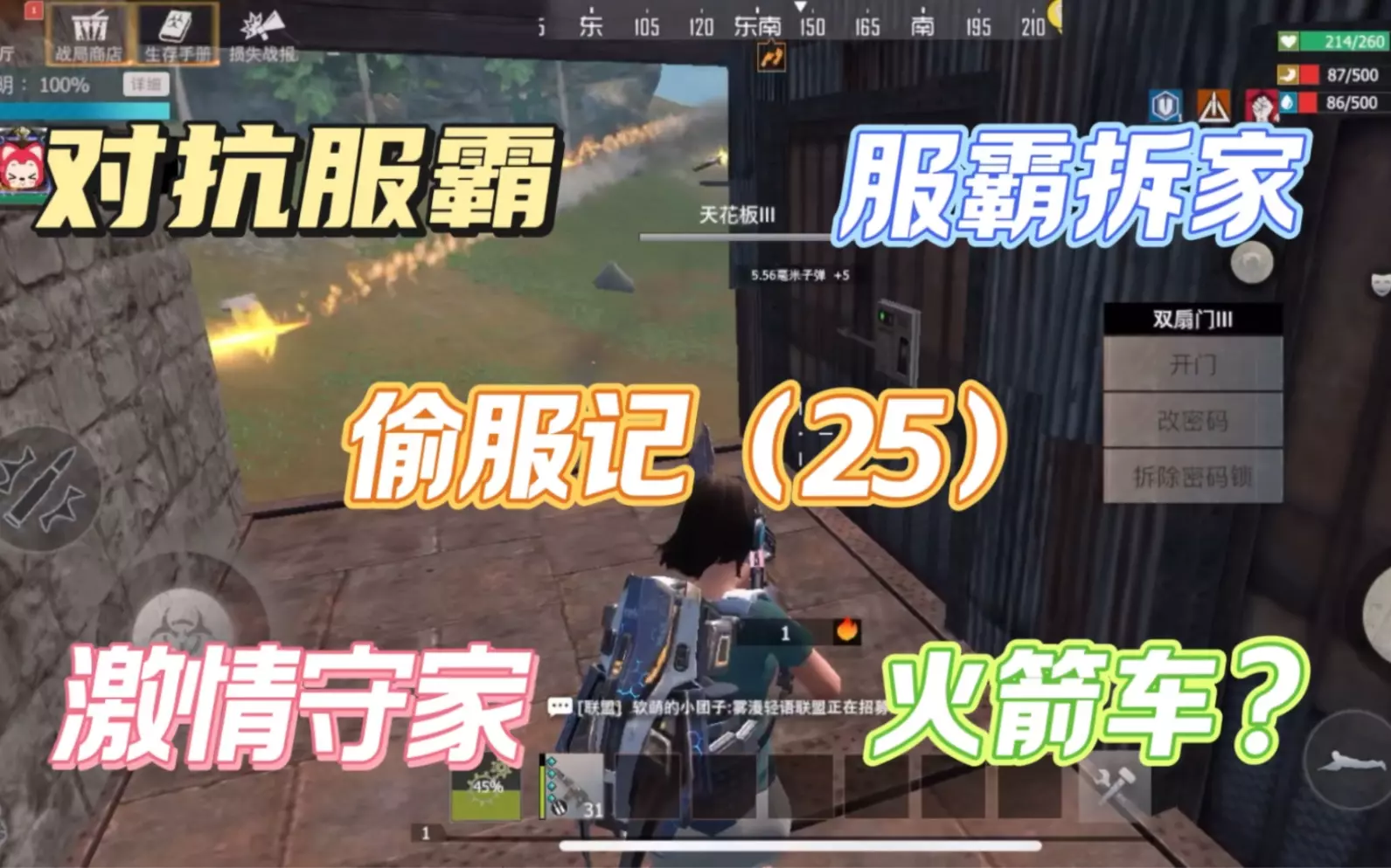 这是《王牌战争》的游戏内容,玩家分享对抗服霸的偷服玩法,通过快速发育,和队友一起用炸药包拆除服霸的炮楼,还能获取矿石等物资,展现了和服霸对抗的游戏过程。