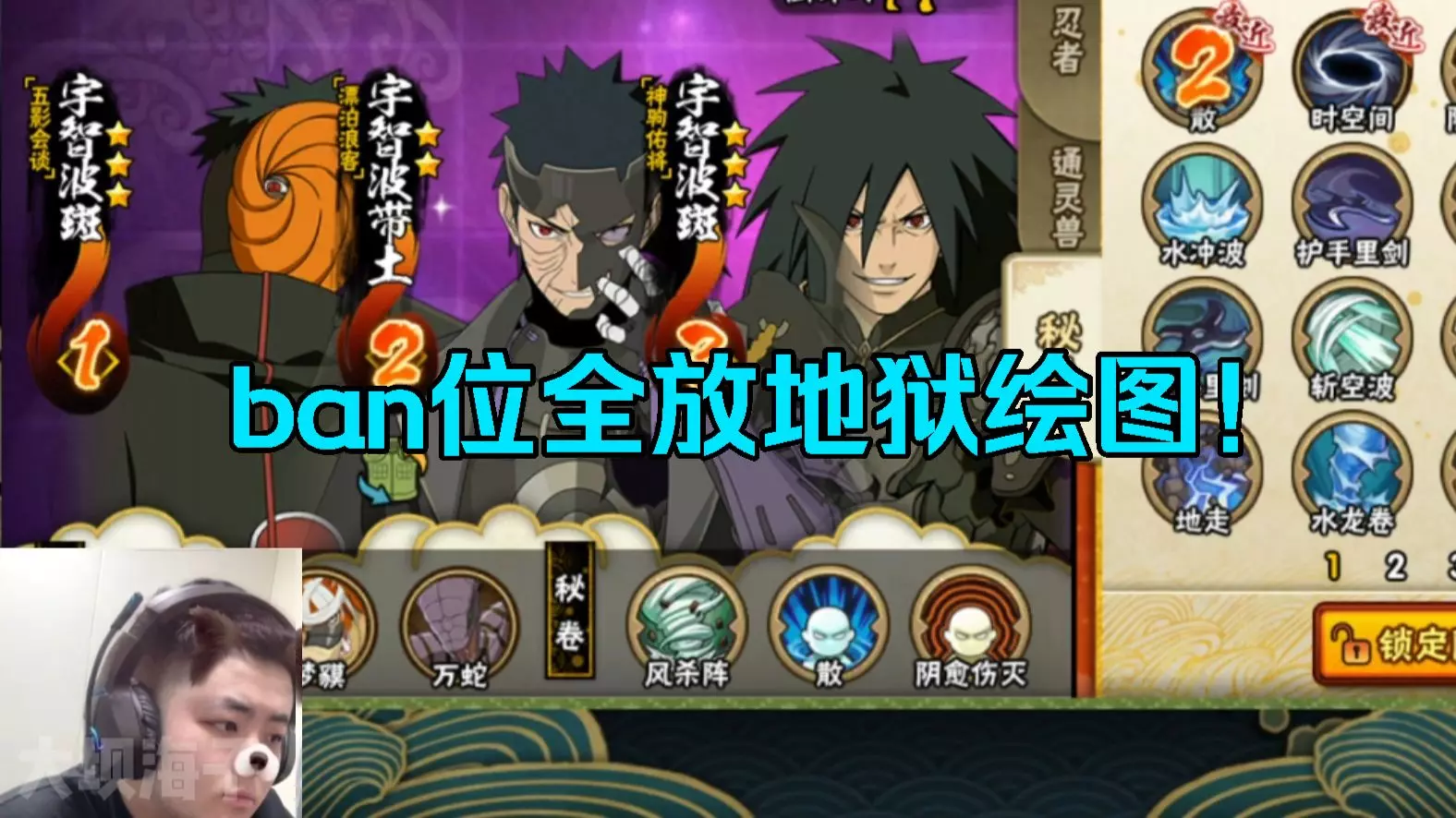 这是《火影忍者》手游的主播抽卡及游戏内容展示,主播参与新春心选招募活动,抽取未获得十尾带土,还展示了猿飞阿斯玛兑换、忍法帖升级等游戏内容,呈现了游戏内的新春活动玩法。
