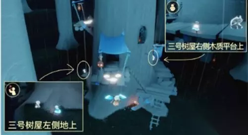 2.一号树屋左侧树干左后方,一号树屋右侧树干后方(靠近出口门)。