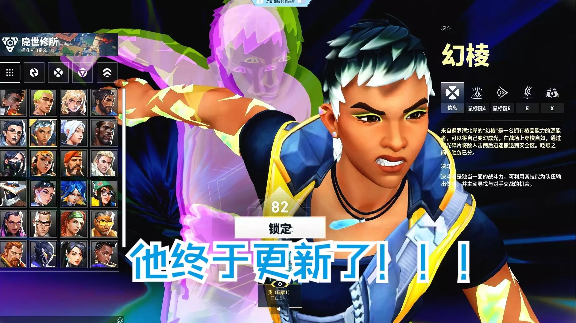 这是一期《无畏契约》尚博勒的教学内容,展示了尚博勒在对局中的实战操作,包括报点、武器使用等,呈现了该角色在对战中的玩法细节。