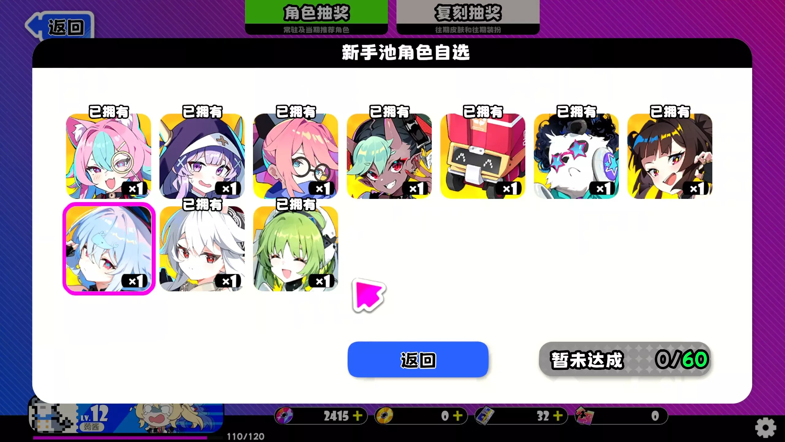 这是游戏《吉星派对》的相关内容,玩家更新进入游戏后,发现自己原本的第一大角色状态有变化,展示了游戏里蓝海晴、凛、茉莉等多位角色及其皮肤界面。