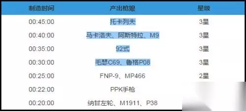 手枪公式: 1.30 30 30 30 2.130 30 130 30 3.150 150 50 30 手枪建造时间一览: