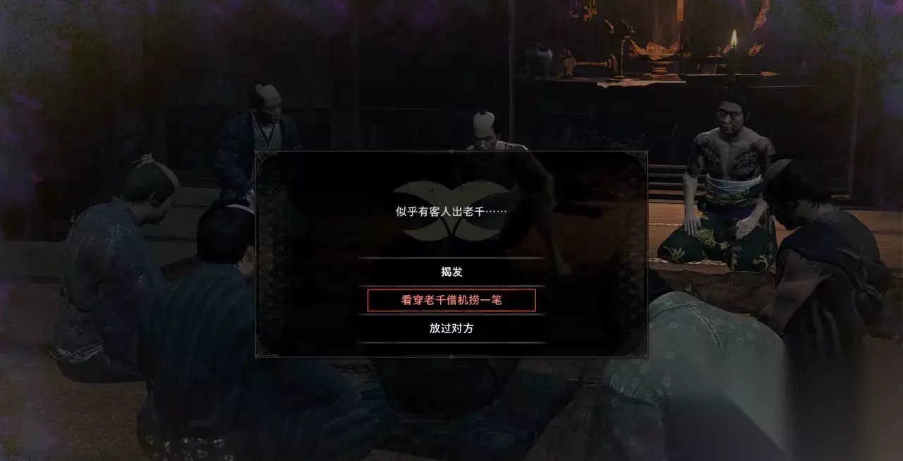 3、然后,系统会弹出两个选项,请选择第二个:“看穿老千借机捞一笔”。 4、观察老千的选择,然后直接跟着他选,就能百分百赢下这一局,并成功拆穿老千!