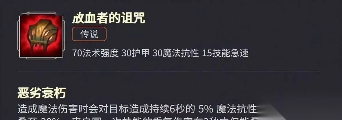 诅咒系列装备选择 黑暗之戒 这是一件基础的诅咒系装备,它提供法术穿透和冷却缩减,非常适合莫甘娜等英雄。 末世之影 这件装备能增强英雄的持续战斗能力,是薇恩等物理输出英雄的首选装备之一。 亡灵之心 亡灵之心能够为英雄提供额外的生命值和法力回复,适合在游戏后期增强生存能力。
