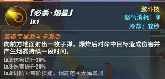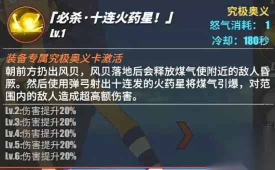 乌索普使用弹弓射出火药星,火药星飞行一段时间以后会对最远端的地方造成伤害,并且会产生爆炸,这个技能是终极奥义,他比较特殊的就是在释放之前他会先向地板拍出一阵烟雾,这个攻击范围是比较短的,会出现有时候打不到的情况,所以我们要注意的就是,我们在释放这个大招的时候,需要控制我方和敌方的位置,避免会空大的情况 激斗技