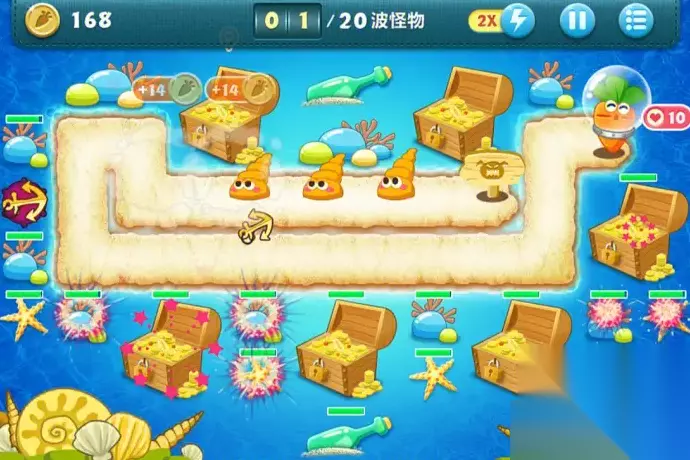 放上蘑菇后如果还有剩余的金币,在不够升级的情况下,可以直接买个鱼骨炮塔放在道路两边,这样我们就有两个炮塔分别来对付第一波的怪物,再让鱼骨去攻击周边的遮挡物,这样就会有源源不断的金币了。只要我们有了金币就先升级炮塔的等级,最好是把蘑菇给提升起来,毕竟蘑菇最后能够产出的金币是非常多的,在和怪物战斗时如果发现没有多余的炮塔的话,那就加快速度多多补上鱼骨。毕竟鱼骨是又能攻击怪物又能攻击周边的遮挡物道具,后面要是有多余的金币那就直接升级全部的鱼骨,接下来的战斗要是蘑菇不够的话,那就继续放,直到能够攻击前面前进的怪物为止。