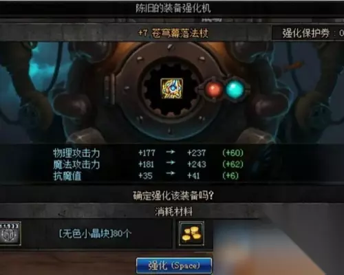 3、凯丽处只是免费的陈旧装备强化机,强化等级高的时候就不足以支撑强化。 4、玩家可以寻找、兑换各种等级的强化机进行强化,增加装备强化成功率。 5、强化失败会扣除材料和装备属性,可以购买增幅券减少失败概率。